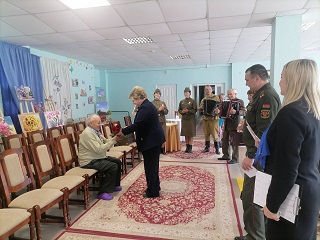 05.05.20255 мая 2025 года поздравить с 80-летием Великой Победы малолетнего узника Брацука Николая Витальевича, который является получателем услуг ГУ "Николаевщинский социальный пансионат "Нёманский", приехали заместитель председателя Столбцовсмкого района Лысая Ж.Н., заместитель начальника отдела идеологической работы и по делам молодёжи Столбцовского райисполкома Жибуль С.Т., директор ГУ "территориальный цент социального обслуживания населения" Жибуль О.О. Они вручили Брацуку Н.В. памятную медаль, подарки и поздравительную открытку от Президента. А представители сферы культуры украсили поздравление музыкальными номерами.